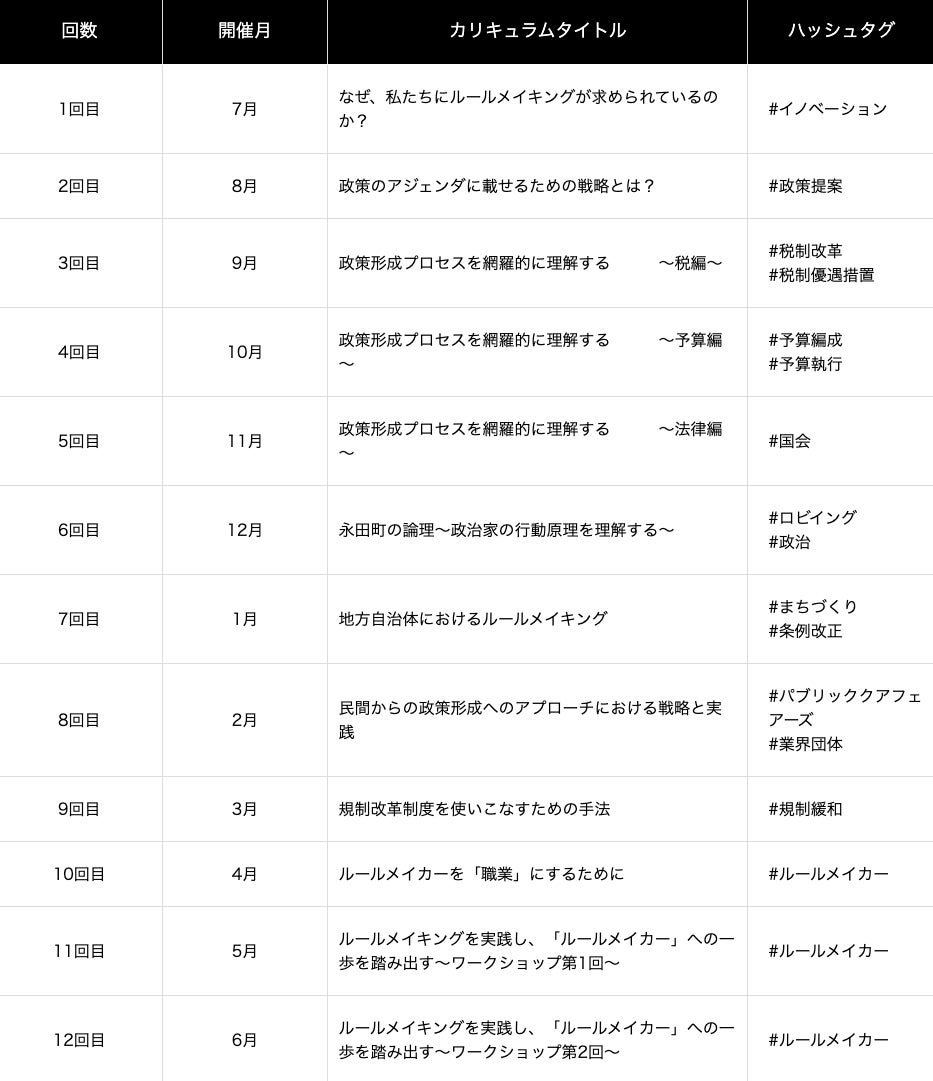 PMIルールメイキングスクールは、2023年7月〜2024年6月まで、月1回の全12回のカリキュラムとなっております。※単発での講座も受講可能です。