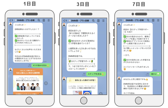 友だち追加日から、適切なタイミングでAIチャットボットが定期的にユーザーと会話しながら商品訴求を行い、中長期的に新規顧客の獲得を目指します。