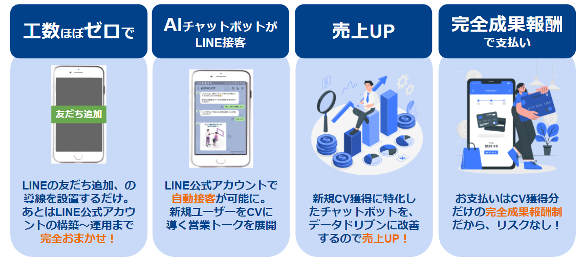 本サービスは、LINE公式アカウントに搭載したAIチャットボットがお客様一人一人に合わせて自動でおもてなしを行い、ユーザーの購買・契約行動を後押しします。導入から運用まで全てお任せの完全成果報酬型のため、工数をほとんどかけることなく実際に増えた新規顧客に応じた支払いのみで売上の最大化を実現することが可能です。