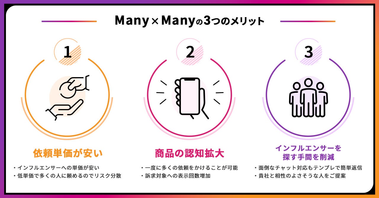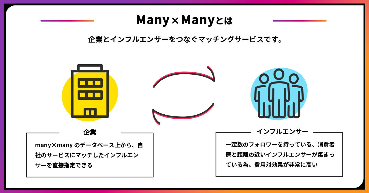 Many×Many(メニメニ)は、インフルエンサーマーケティングを実施したい企業と、これからインフルエンサーとしての活動を頑張りたいナノインフルエンサーを繋げるマッチングサービスです。