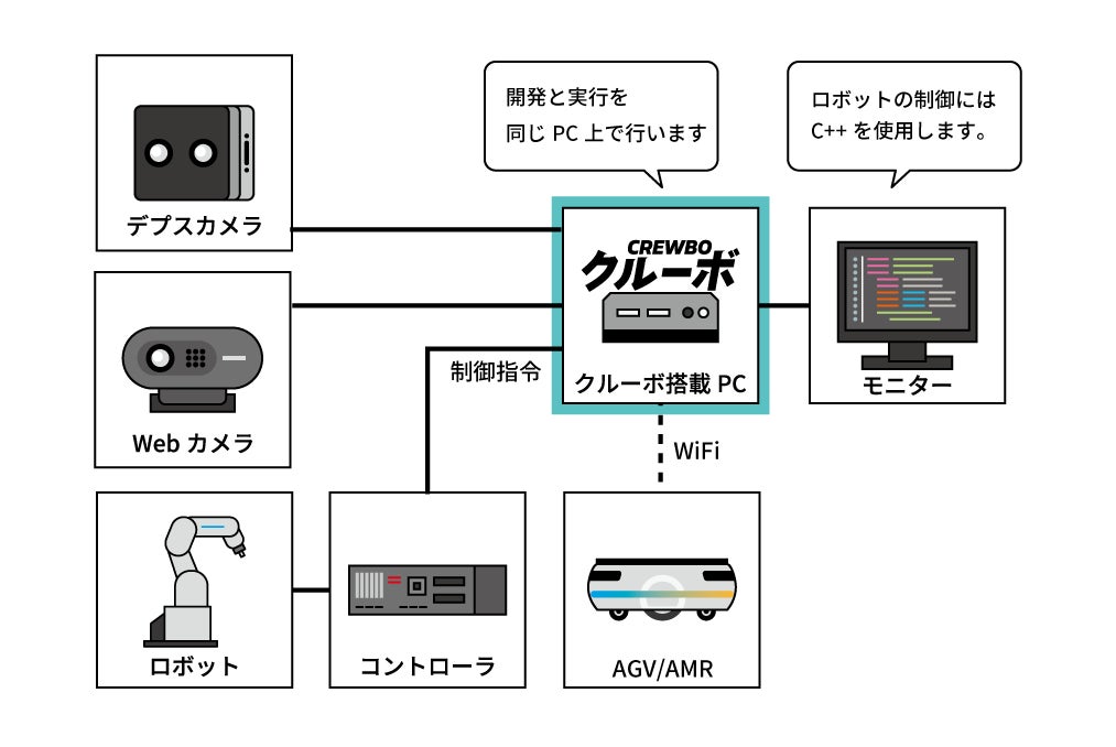 クルーボはだれでも簡単に、カメラを使った高精度なロボット制御ができるプログラミングソフトウェアです。チトセロボティクスが発明した「キャリブレーションの負担なしで、0.02mmの超高精度制御を実現するロボット技術」を買い切りでご提供します。高度な画像認識と高速なロボット軌道制御が可能なコンピュータも付属し、必要なソフトウェアはすべてインストール済みなので、すぐにお使いいただけます。