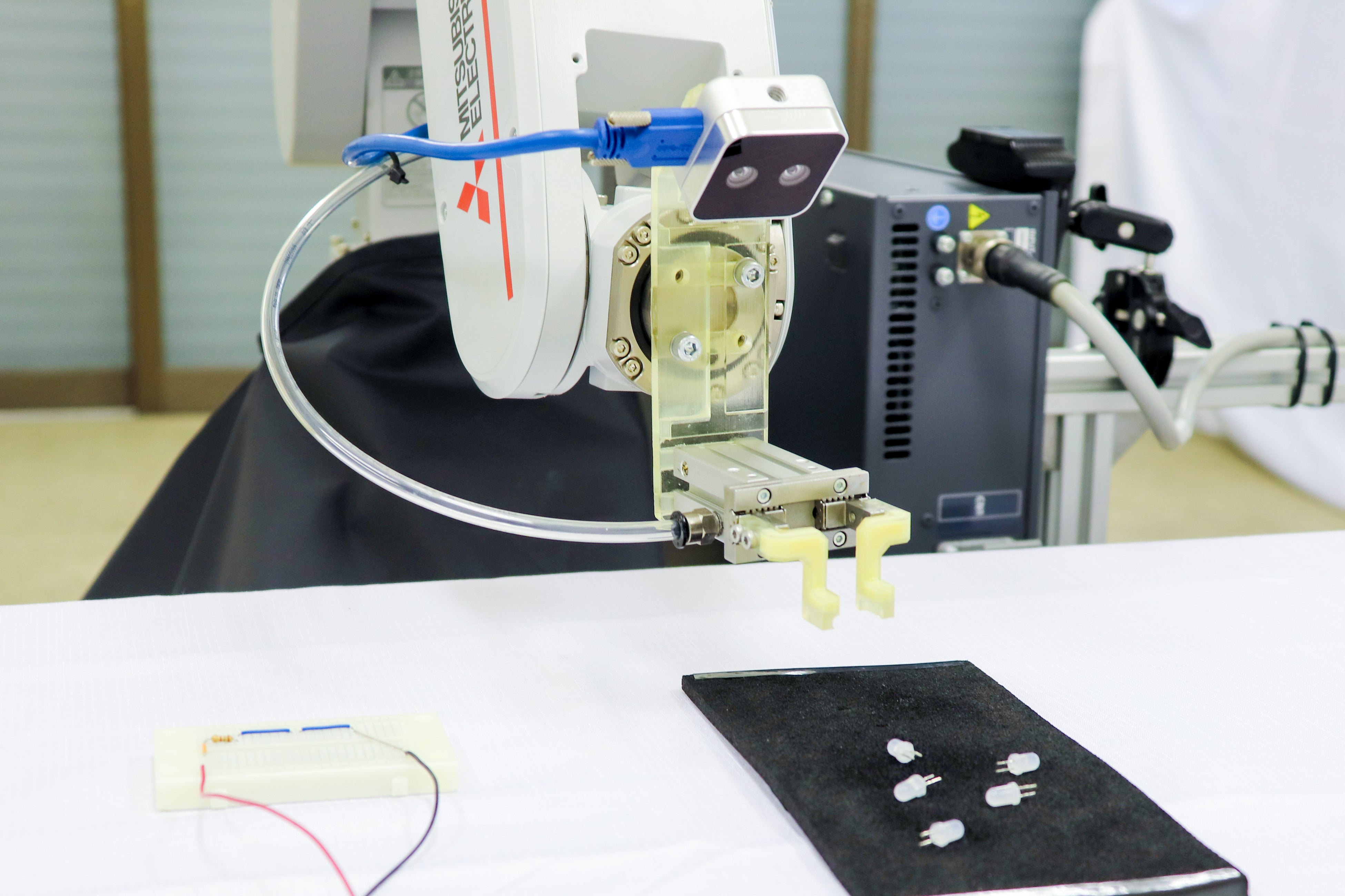 LED部品の足は0.5mm、ブレッドボードの穴径は0.7mmで、モバイルマニピュレータによるキャリブレーションレスの高精度制御を実現しました。