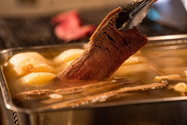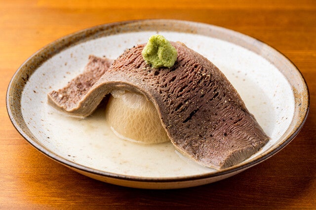 イチオシは牛タンいろ葉の看板メニュー「名物茹でタン」。箸ですっと切れるほどに柔らかい絶品の茹でタンは、当店独自の方法で5時間じっくりと煮込み、柔らかく仕上げています。茹でタンの下に添えられるのは、牛タンから出る旨味と出汁を存分に吸い、味のしみわたった大根。わさびをのせてさっぱりと頂くと、お酒との相性抜群。メディア取材も多く、リピーターも多い当メニューは、ご来店のお客様に必ず召し上がって頂きたい逸品。