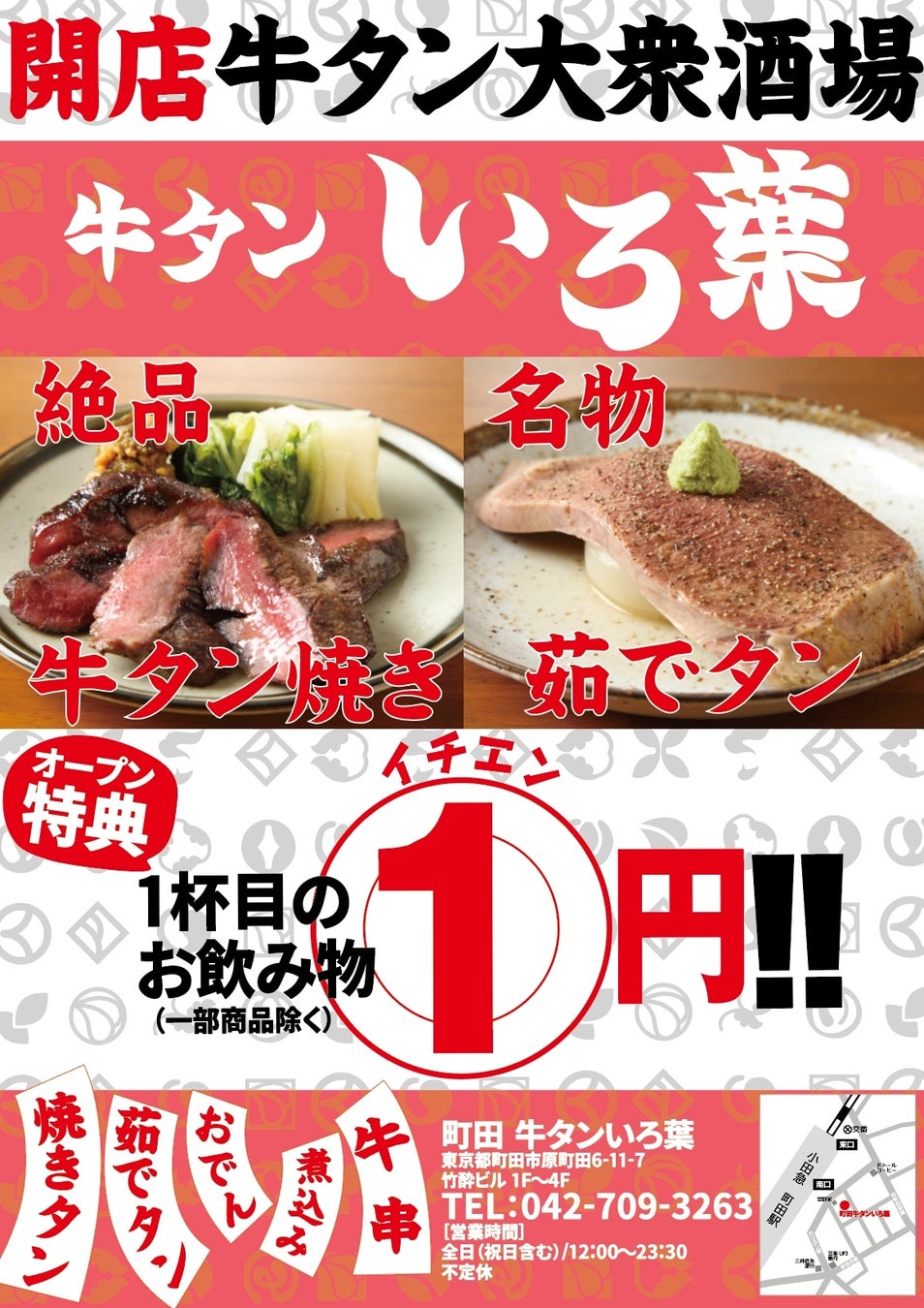 町田牛タンいろ葉では、オープニング特典として「1杯目のお飲物1円‼」のキャンペーンを実施します。クーポンのご利用詳細は下部をご確認ください。