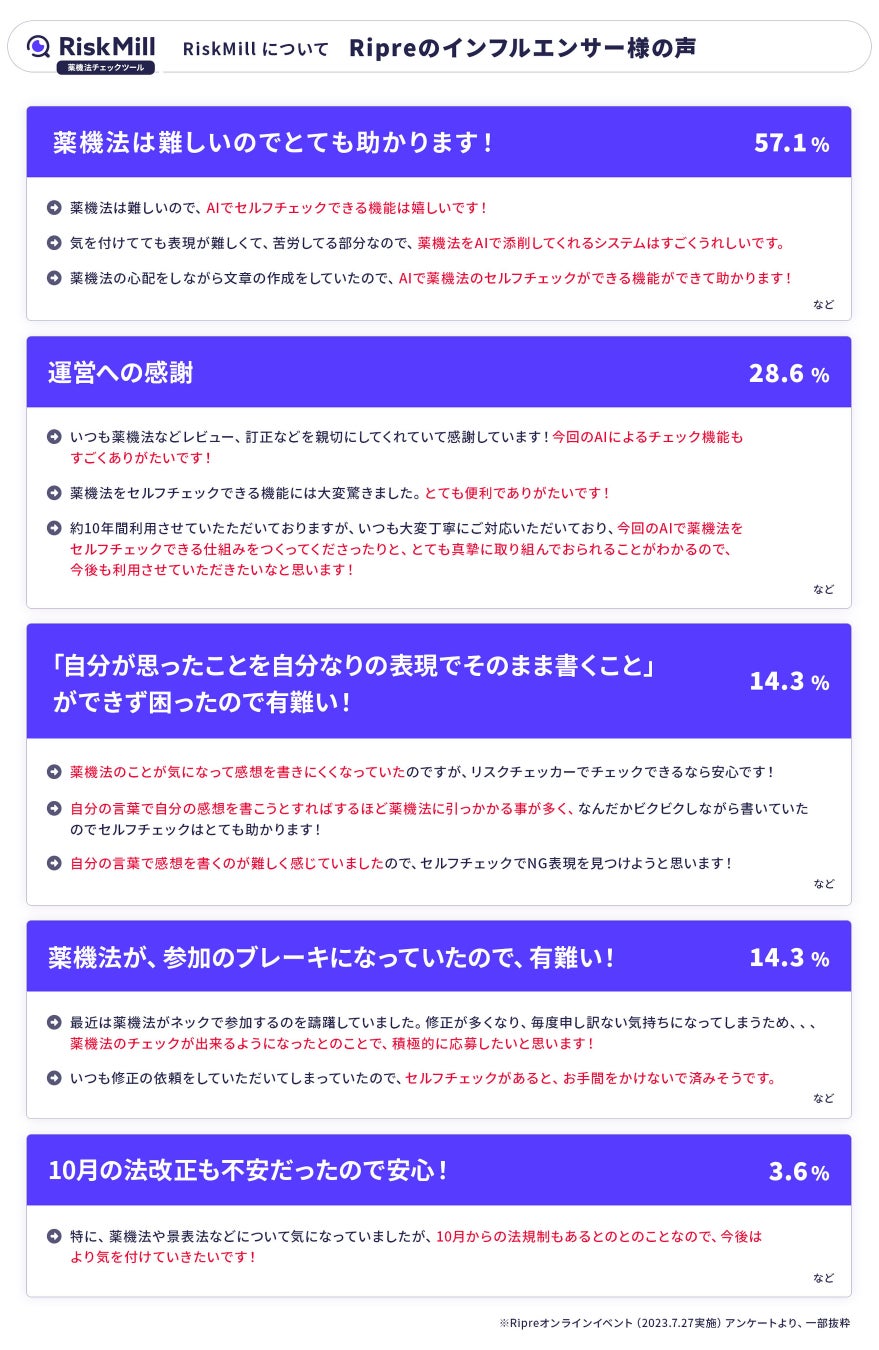 いち早く当サービスを導入したSNSモニターサンプリングサービス「Ripre」(運営:サイバー・バズ)では、毎日130名以上のインフルエンサーが自主的に「RiskMil」を用いて、薬機法のセルフチェックを実行しており、月間のチェック数は6,000回以上に達します。2023年7月に行われた「Ripreオンラインイベント」では、参加したインフルエンサーから薬機法をセルフチェックできる新機能について、好意的な反応が多く寄せられました。