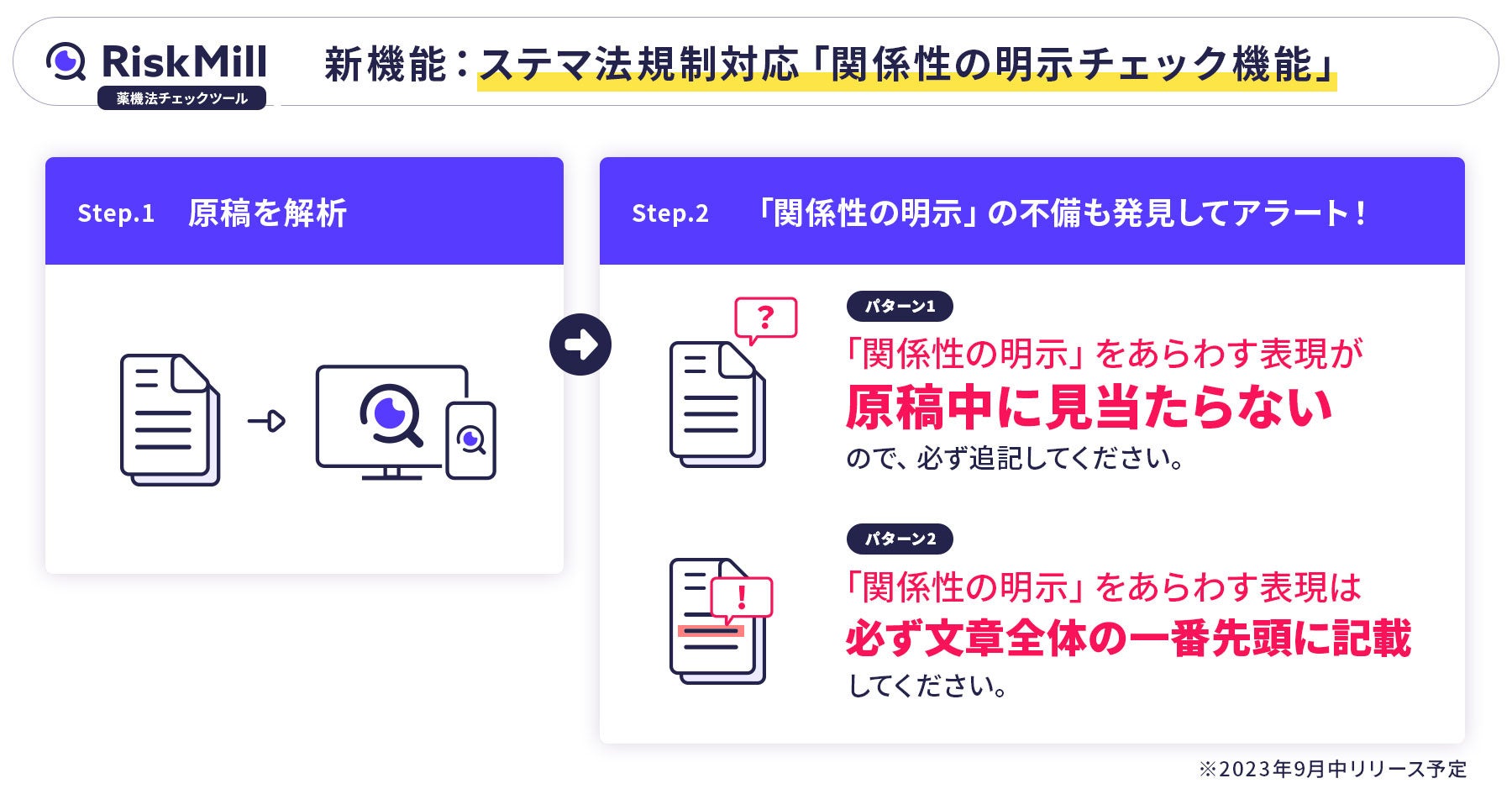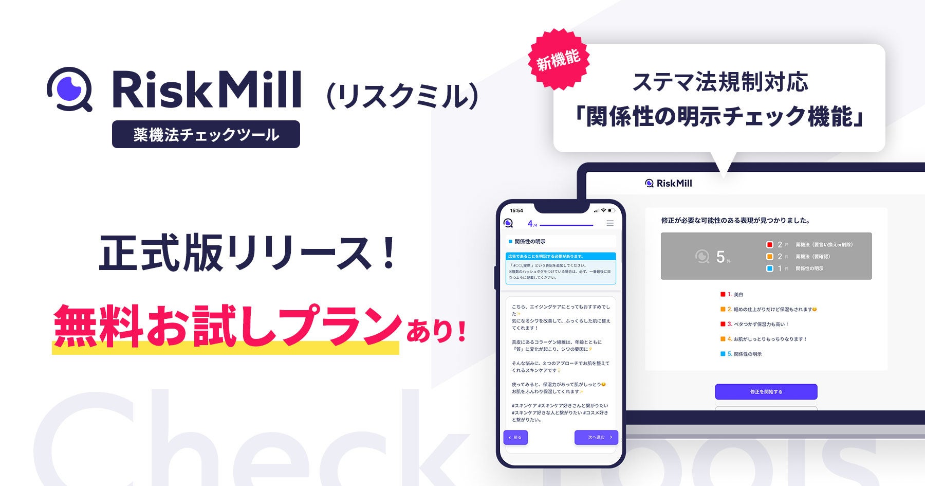 株式会社Crew(代表取締役:柳澤龍一、本社:東京都渋谷区)は、2023年4月よりβ版(無料)を提供している、AI薬機法チェックツール「RiskMill(リスクミル)薬機法チェックツール」(以下、「RiskMill」)の正式サービスの提供を開始いたしました。また、新たにステルスマーケティングに関する法規制に対応した「関係性の明示チェック機能」を追加することをお知らせいたします。