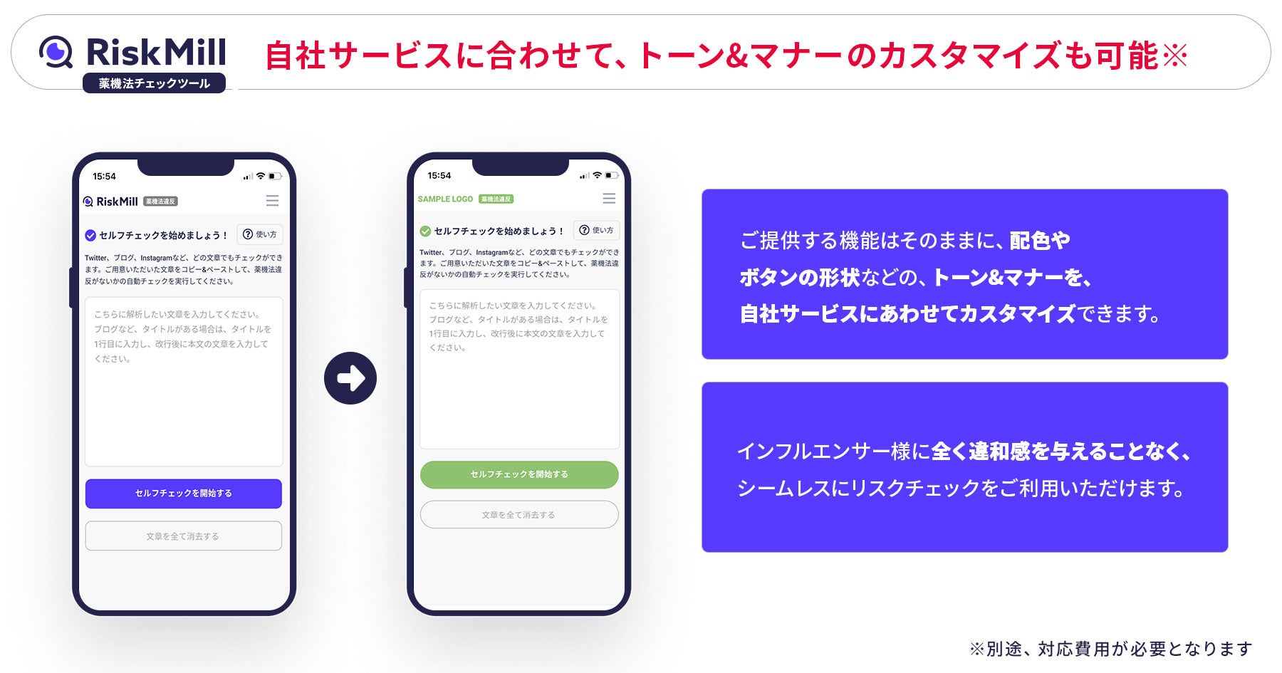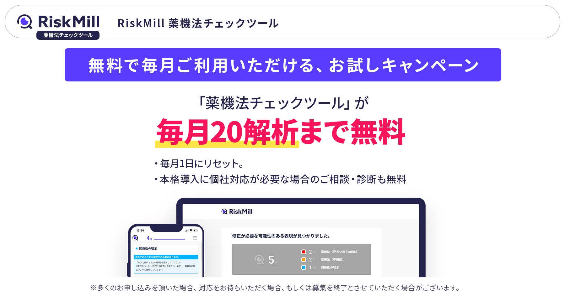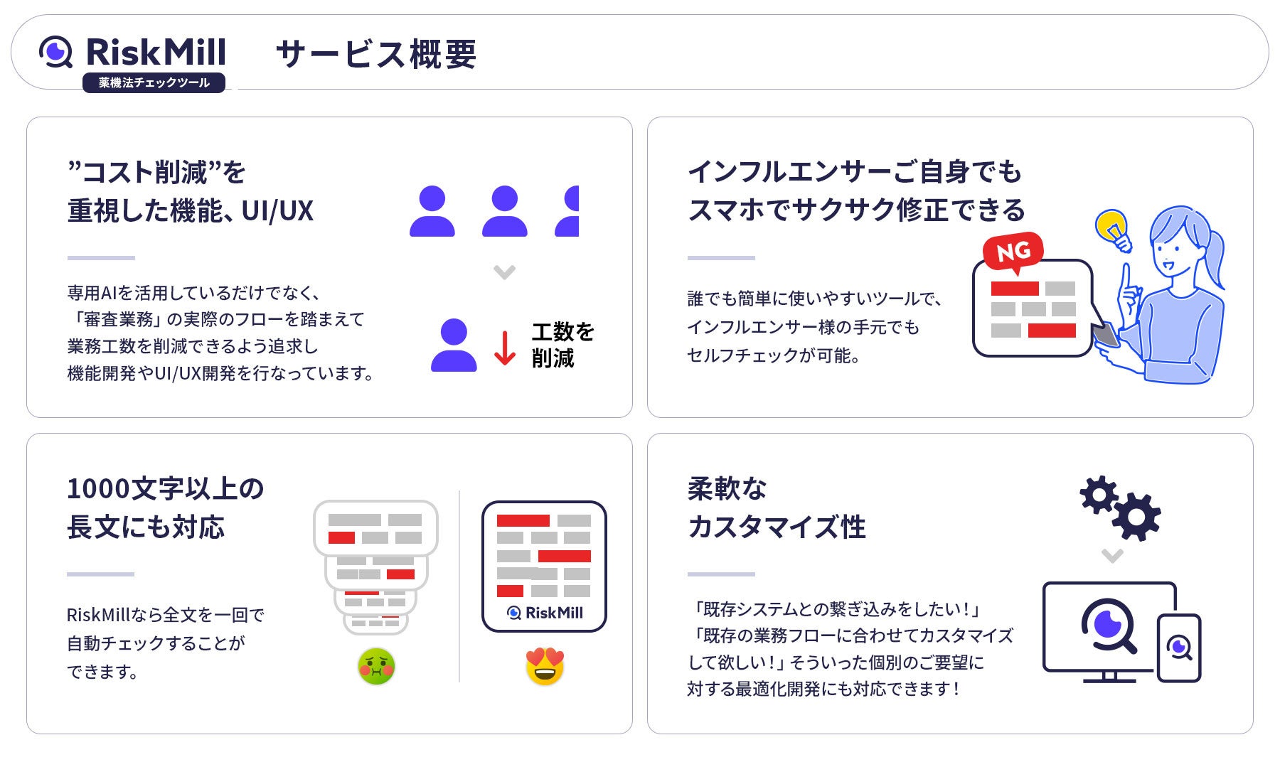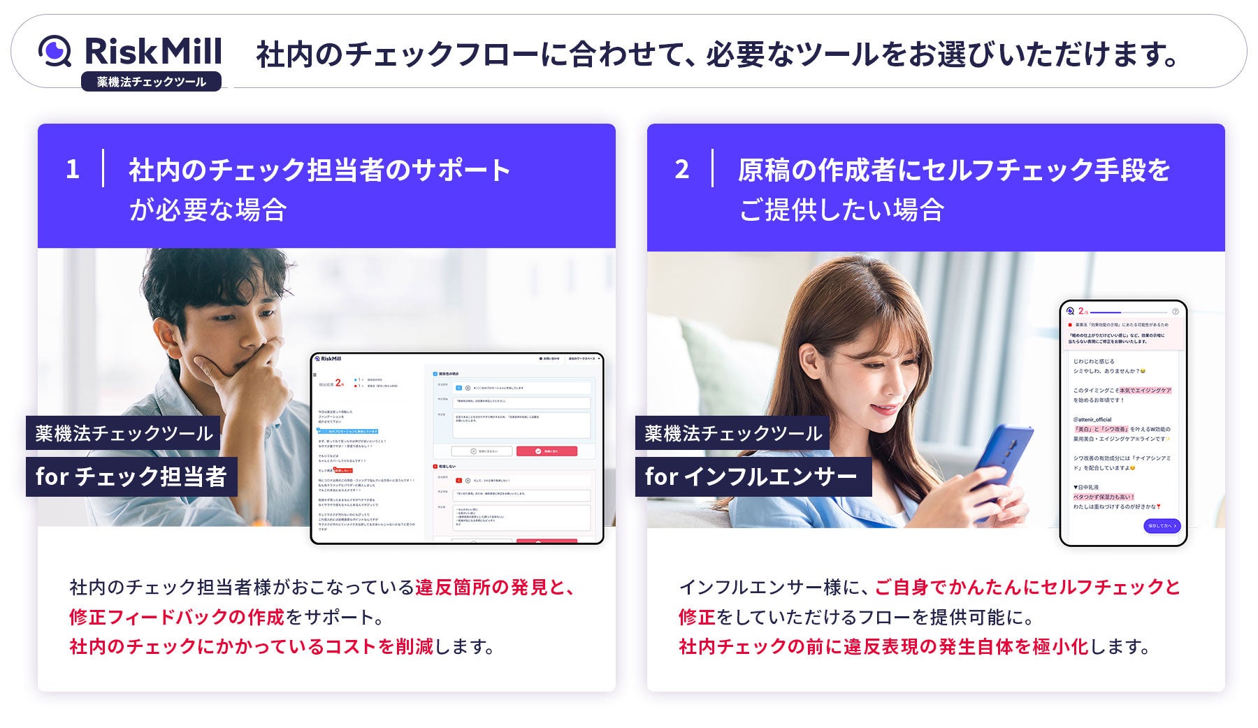 ソーシャルメディアマーケティングやモニターサービス、D2C、ECなど、化粧品や健康食品に関わる市場が拡大し、「薬機法や景表法など関連法規の遵守」の重要性も増々高まってきております。そして2023年10月1日からは、いわゆる「ステルスマーケティング」の法規制が施行開始となり、違反すると措置命令などの行政処分の対象となります。関連事業者にとって、薬機法・景表法に即した表現のチェック・修正といった専門知識を要する校正業務の正確性の向上、及び体制強化が喫緊の課題となっている中、「RiskMill」は、導入企業様の化粧品や健康食品に関する広告表現や、導入企業様に参加するインフルエンサーの皆さまが安心してライティングできるよう、薬機法をはじめとした違反表現の発見・修正をサポートします。
