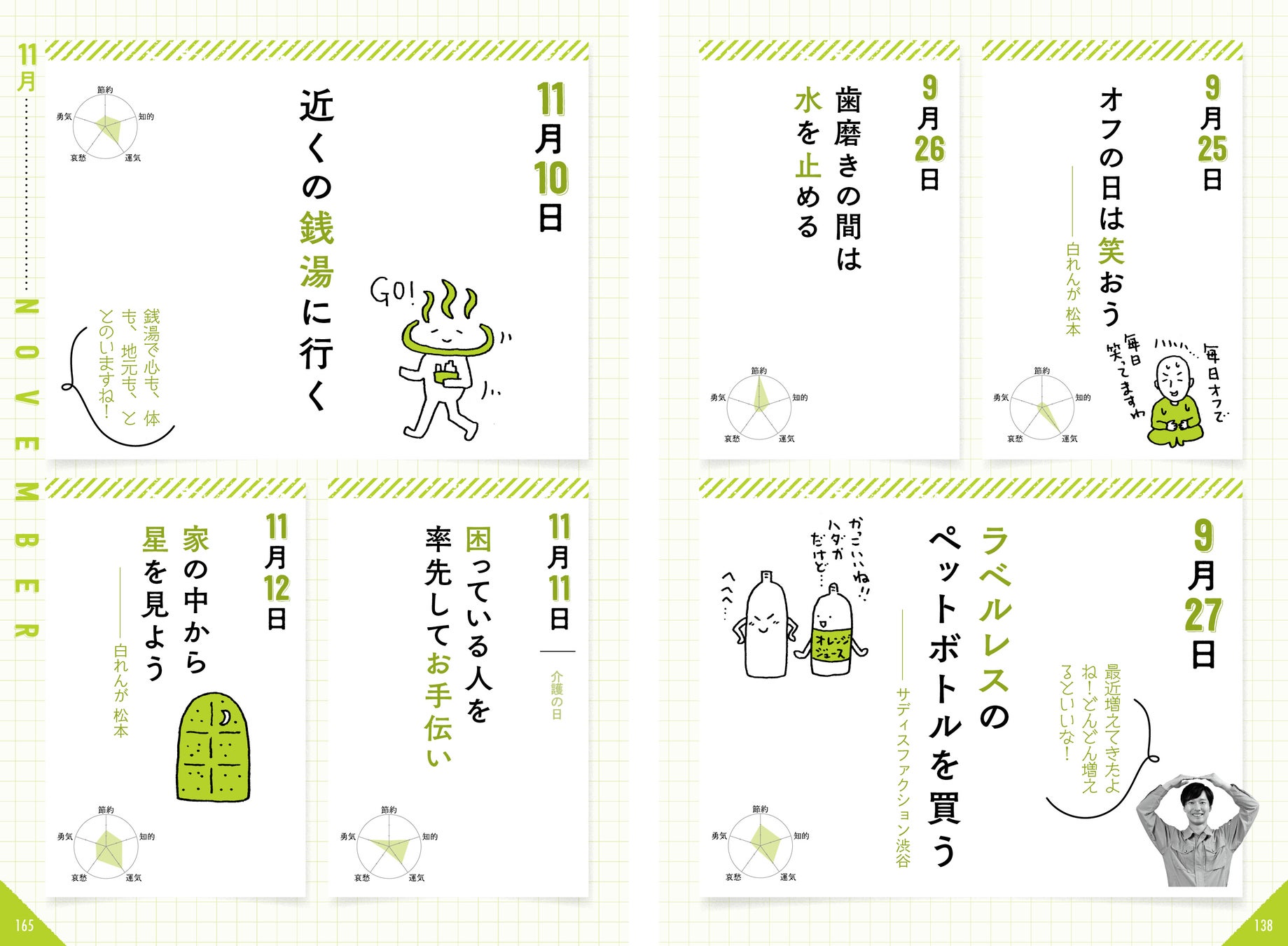 かわいいイラストと滝沢メモが誌面を賑やかにしてくれます。難しい内容はいっさいナシ。好きな日に、ふとしたときに、めくったページのアクションにチャレンジ。 SDGsは我慢することではなく、一日一日を丁寧に過ごすこと。身近な日常からSDGsのヒントを探せる一冊。