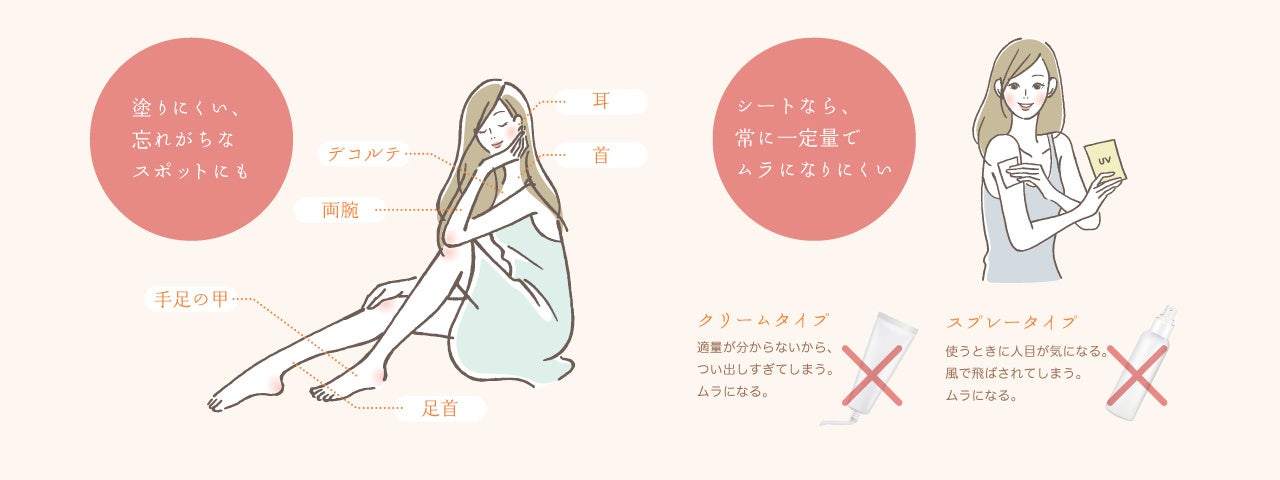 本製品は、日焼け止めとボディシートの機能を融合させた全く新しいUVケアアイテムです。