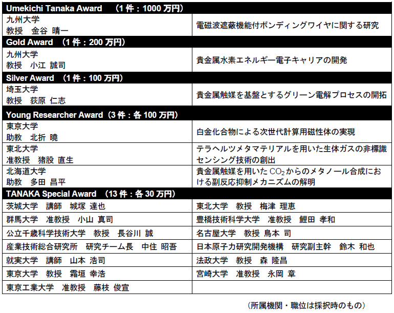 田中貴金属記念財団 「貴金属に関わる研究助成金」の受賞者を発表