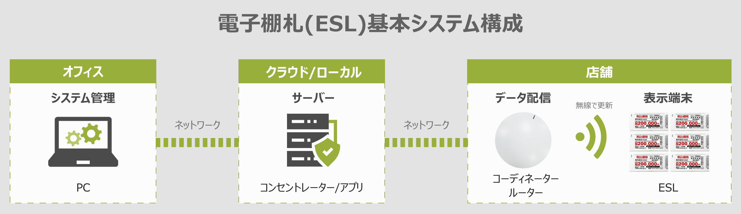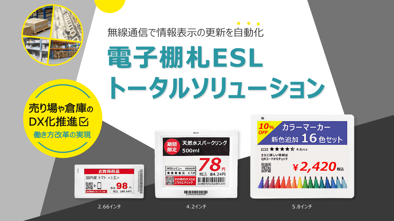 電子棚札(Electric Shelf Label, ESL)は、従来の紙の棚札の価格やラベルなどの表示をデジタル化するソリューションです。価格や情報を管理しているデータベース、販売管理システムなどと連携させ、棚札の書き換えを無線で実施することにより、時間と人員の必要だった更新作業を効率化できコスト削減できるだけではなく、タイムリーな価格変更、情報表示により効果的な販促が可能となります。