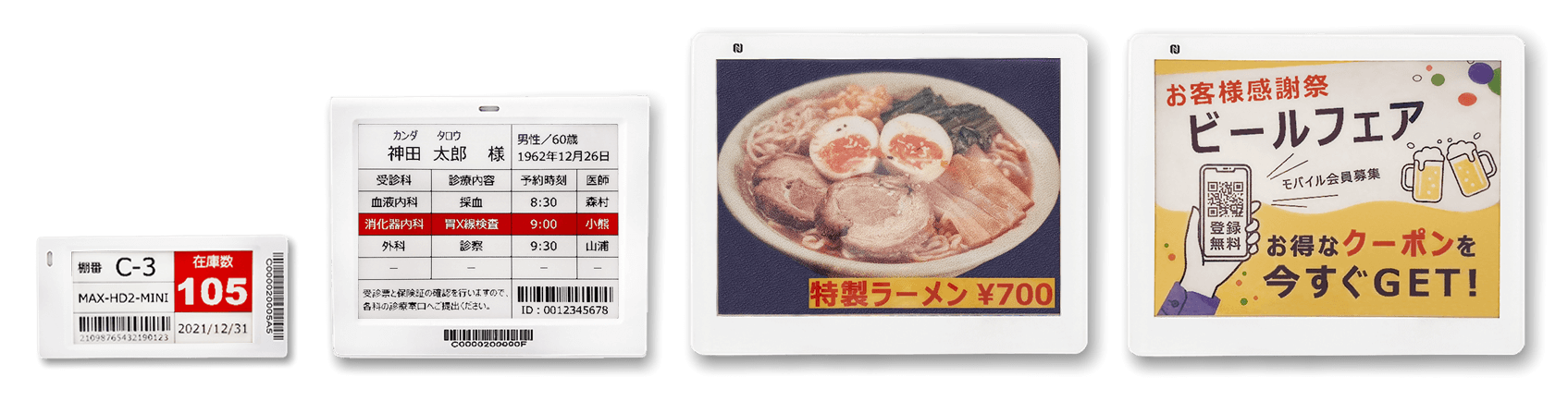 3色の2.66インチ、4.2インチサイズの他、5.8インチサイズには7色の電子ペーパーを採用し、従来の値札用途だけではなく、写真の表示やカラフルさで視覚に訴える販促など、広い用途へ活用頂くことが出来ます。