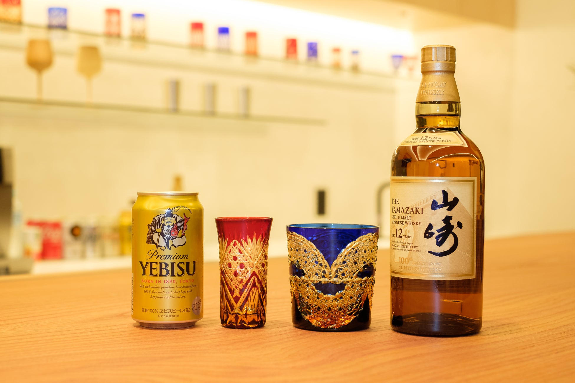 飲食物には、ウィスキーの山崎12年をはじめ、ビールや日本酒など多彩に取り揃えております。