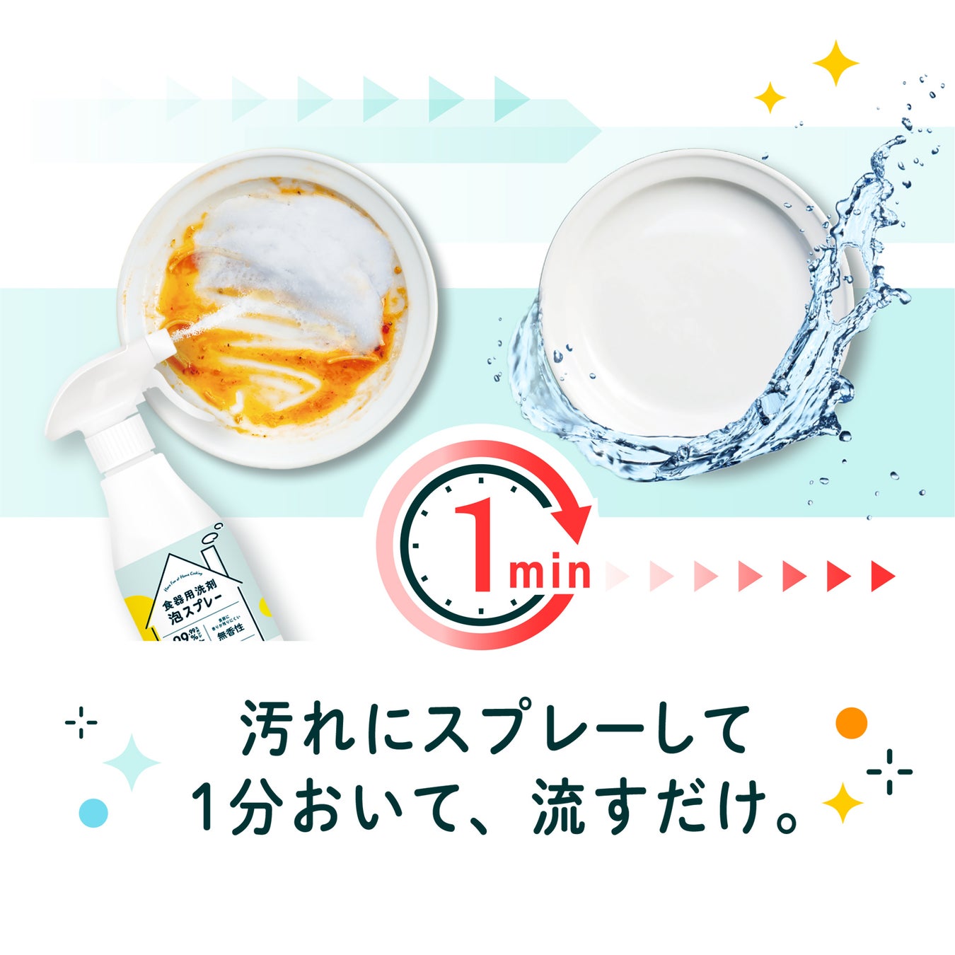 泡の力でしっかり汚れを落とすから、こすらず1分置くだけで食器の洗浄・除菌ができます。
