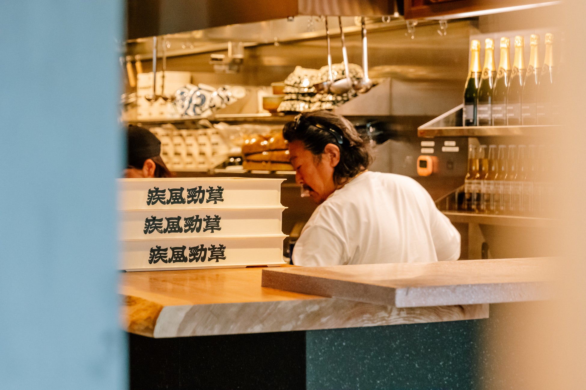 「疾風勁草」では、うどんが湧き上がる湯の中で舞う様子を、和の舞台芸術である「能」の舞に重ね合わせ、その情景を象徴する「松」と「竹」を店のシンボルとして採用しました。このコンセプトを新しい時代の感覚で表現するため、BAKIBAKI氏に依頼し、店内の壁一面にダイナミックなアートを描き上げていただきました。訪れるお客様は、BAKIBAKI氏の繊細で力強いアートを楽しみながら、うどんを堪能できる贅沢な空間をご体感いただけます。
