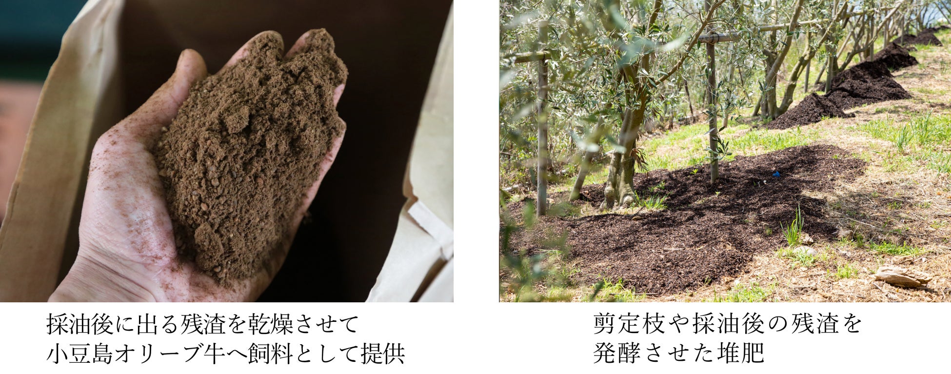・東洋オリーブでは、品質の追求はもちろんのこと、廃棄物の削減や資源の有効活用を目指して、採油後の残渣を乾燥させたオリーブ牛への飼料提供(2010年〜)、有機栽培/オリーブ堆肥づくり(2014年〜)など、地域内で資源を循環させる「循環型農業」に長年取り組んできました。