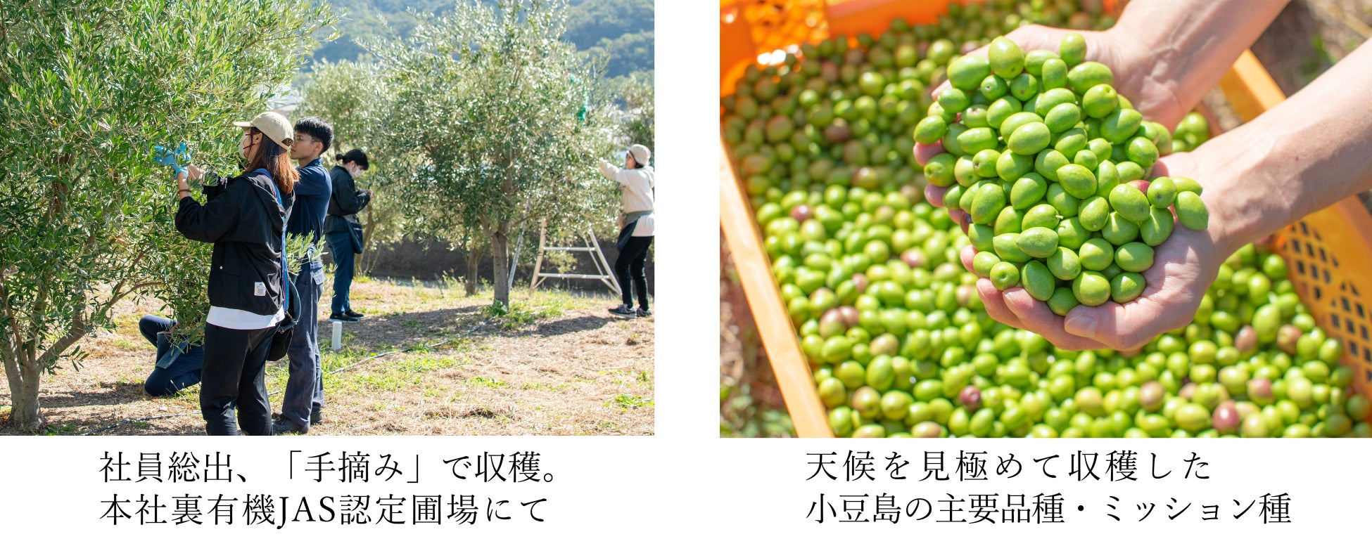 ・オリーブの実は、落ちたり、強く当たった箇所から傷みます。海外には機械収穫する大規模農園も多いですが、実も木も傷めます。東洋オリーブでは一粒ずつ丁寧に「手摘み」で収穫しています。