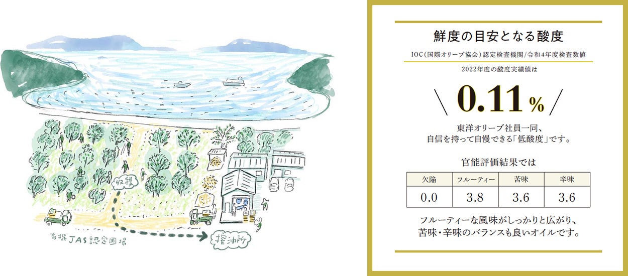 ・海に面した本社裏に広がる有機JAS認定圃場(約400本/0.8ha)で収穫した、小豆島のオリーブ主要4品種中、最主要品種「ミッション種」単一品種で搾りました。