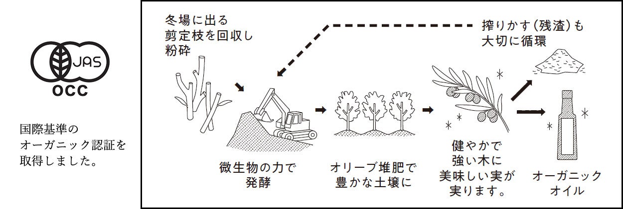 ・国際基準のオーガニック認証取得。循環型 有機栽培。オリーブ堆肥と水だけで育てました。