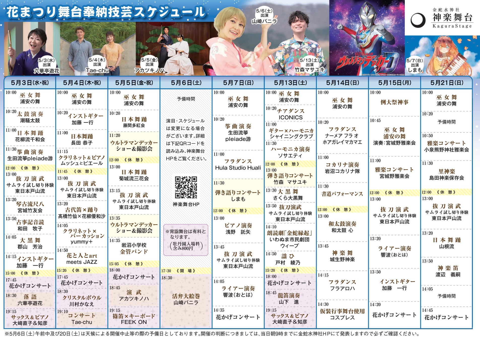 また本年より、花まつりに合わせて牡丹園並びに境内の「宵詣(よいもうで)(夜間ライトアップ」を行います。昨年竣工しました神楽舞台においても 、昼の奉納技芸舞台と合わせ、夜の宵詣舞台も行われます。
