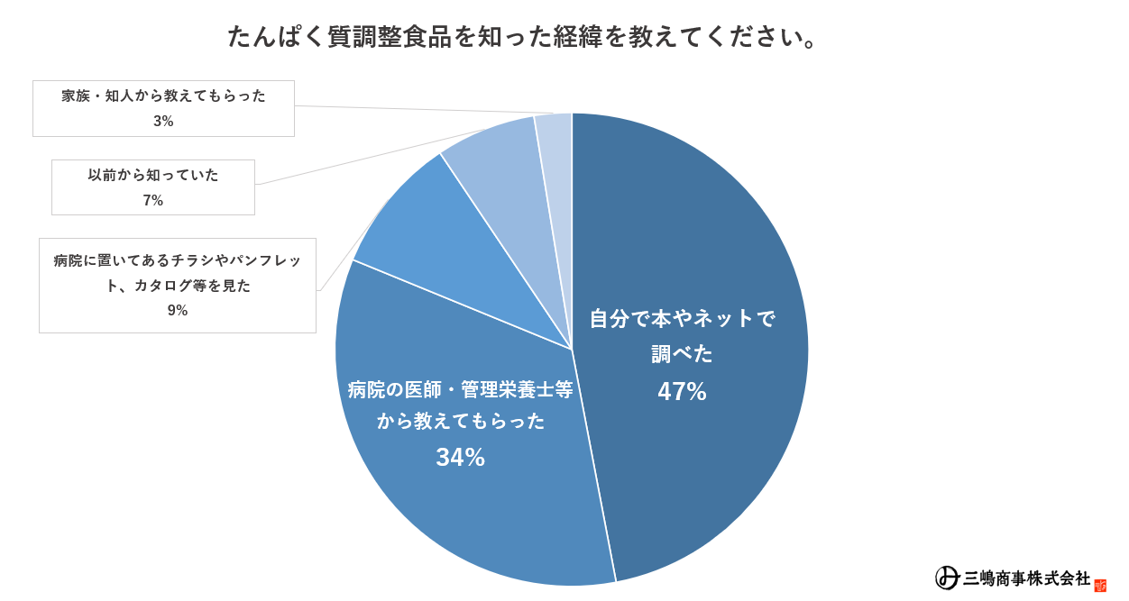 そのような人の食事をサポートする食品として販売されているのがたんぱく質調整食品であり、通常の食品に比べてたんぱく質含量が少ないことが特徴です。今回の調査でそれらを知った経緯について聞いたところ『自分で本やネットで調べた(47%)』という回答が多く、食に関する意識の高さが伺える結果となりました。