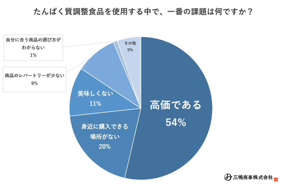 たんぱく質調整食品を使用する上での一番の課題について聞いたところ、『高価である』が54%を占めました。