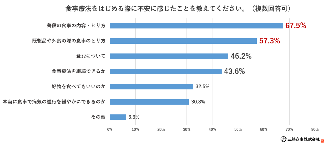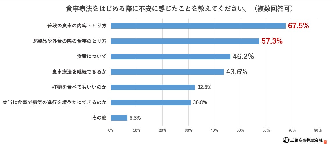 「食事療法をはじめる際に不安に感じたことを教えてください。(複数回答可)」とアンケート調査を行ったところ、『普段の食事の内容・とり方(67.5%)』、『既製品や外食の際の食事のとり方(57.3%)』に不安を感じた人が半数以上いることがわかりました。