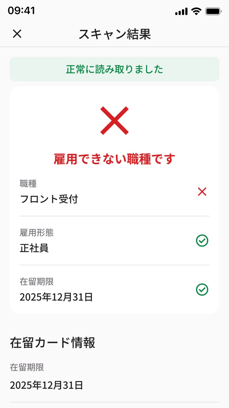 「職種」と「雇用形態」を入力し、在留カードにiPhoneをかざすだけで就労可否が表示されます。専門知識がない方でも、簡単かつ正確に雇用できるかどうかを判断できるようになります。