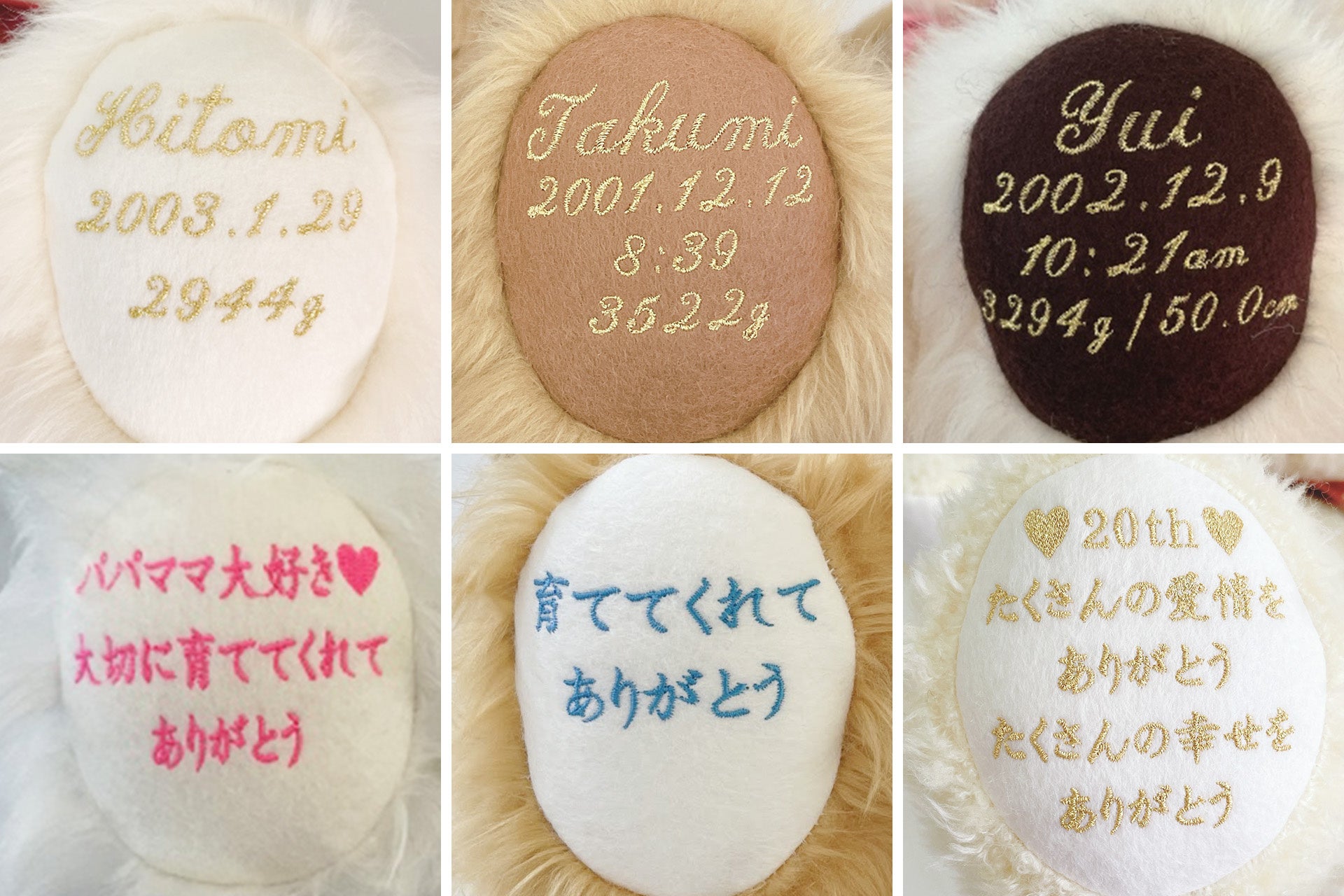 その異なる重さ(体重)を1g単位で再現し、ご希望で、お名前・生年月日、メッセージなどを刺繍することで、長く愛していただける世界で一つだけの宝物になります。