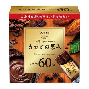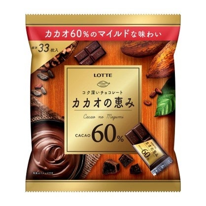 また、今年4月11日(火)から、マイルドな味わいが特徴の、「カカオの恵み 60%」のシェアパックと箱も新発売いたします。