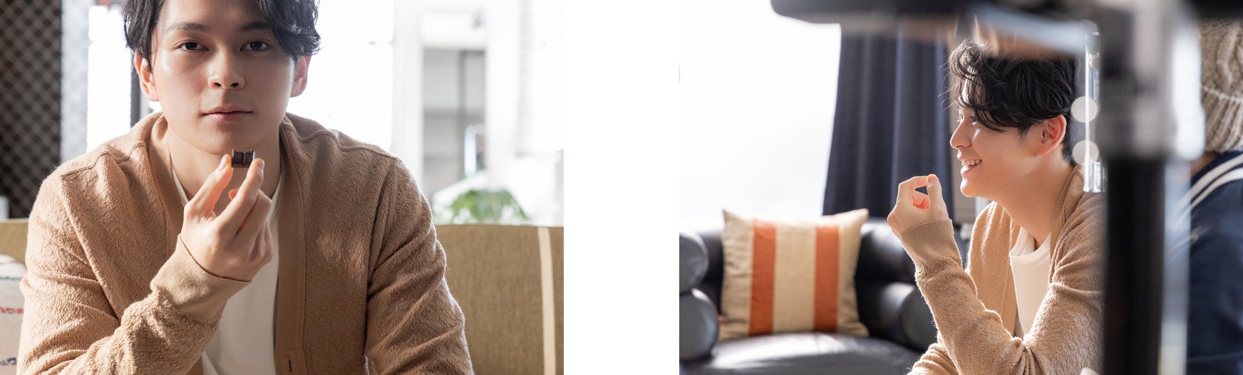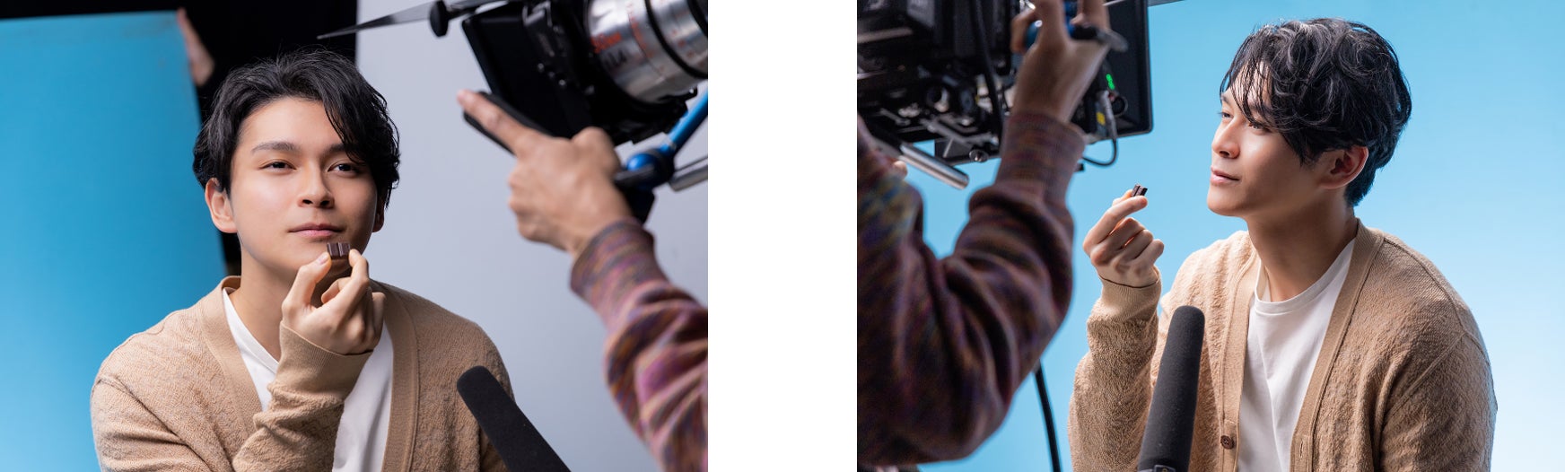 恋愛ドラマを彷彿とさせるような演技はさることながら、もう一つの注目ポイントが、「カカオの恵み」を堪能しているときの表情です。撮影時は、「カカオの恵み」を実際に食べていただきながら、その味わいを表情で表現していただきましたが、元々甘いものがお好きだというだけあって、その表情はピカイチ。商品の特徴である“コク深く、ほの甘い”味わいをそのまま体現したかのような表情に、監督も思わず唸ってしまうほどでした。