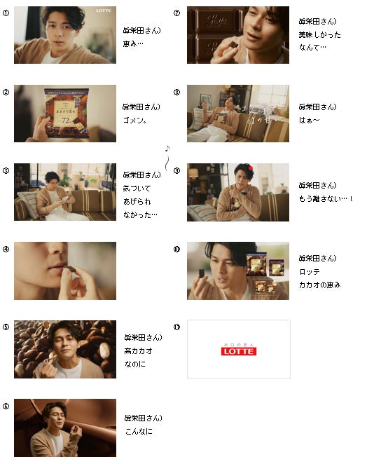 今回の「カカオの恵み」の新TVCM、いかがでしたでしょうか?今回は、僕が「カカオの恵み」をとことん愛している、そして少し「カカオの恵み」を擬人化したような表現をしています。僕自身も、( 「カカオの恵み」は)すごく美味しいなと思っていますので、皆さんにも「カカオの恵み」の美味しさが少しでも伝われば良いなと思っています。ぜひ、ご覧ください!
