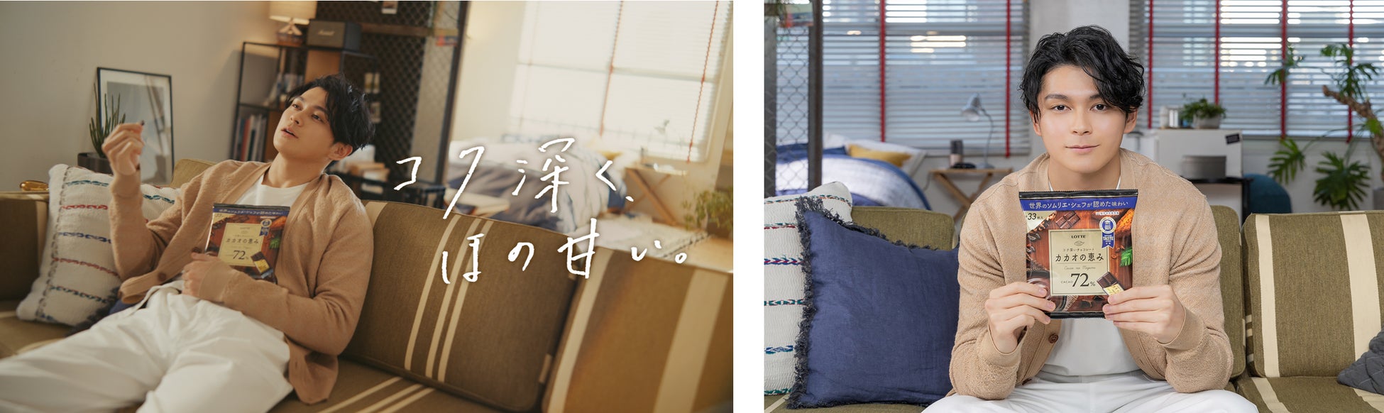自宅で眞栄田さんから突然「ゴメン・・・。」と至近距離で切り出される「恵み」。眞栄田さんが愛情を込めた優しいまなざしで語りかけていたお相手は、どんな方かと思いきや、なんと高カカオチョコレートの「カカオの恵み」!「カカオの恵み」が、“高カカオなのに美味しい”ことに気づけていなかった、と謝り、愛する「カカオの恵み」を口にして、その“コク深く、ほの甘い”味わいをじっくりと堪能します。感情が抑えられなくなった眞栄田さんは、「もう離さない!」と「カカオの恵み」を情熱的に胸元に引き寄せ、最後は「カカオの恵み」に対し愛情たっぷりに「ロッテ カカオの恵み」と呼びかけ、TVCMを締めくくります。