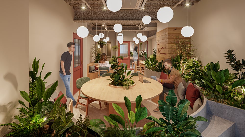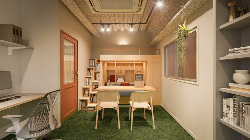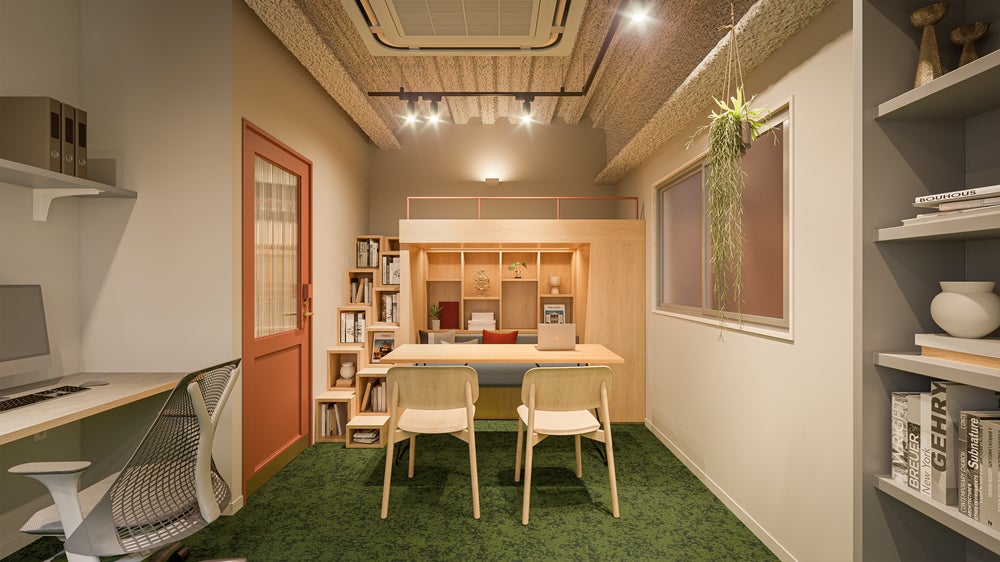 コワーキングスペースは自然豊かなデザインで、忙しい日々の中で安心感を感じられるひと時を提供します。