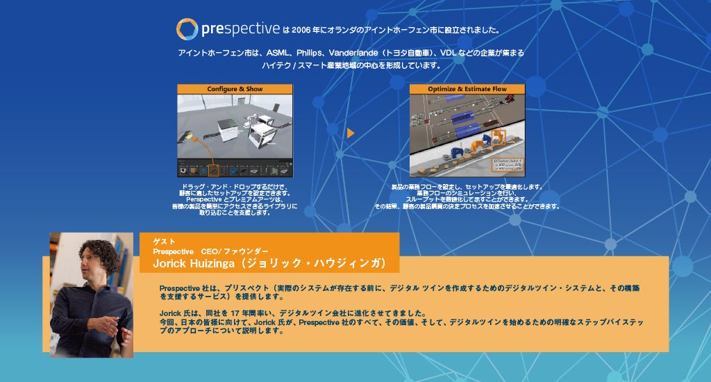 今回のセミナーでは、オランダに本社を置く、Prespective社の代表兼創業者である<Jorick Huizinga(ジョリック・ハウジィンガ)>氏をゲストに迎え、欧州での事例などを交え、Prespective社のすべて、その価値、そして、デジタルツインを始めるための明確なステップバイステップのアプローチについて説明します。デジタルツインの世界は、ものすごいスピードで拡大しています。最新の動向と、今後の進め方のヒントなどを、ぜひ本セミナーにて。