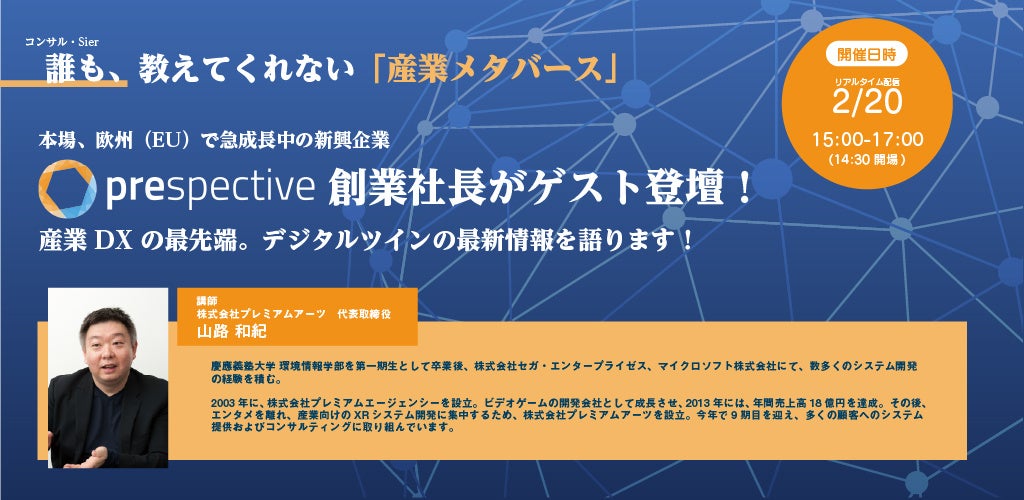 株式会社プレミアムアーツ(代表取締役:山路和紀)は、2月20日(火)、「産業メタバース」無料オンラインセミナーを開催します。