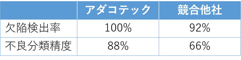 本件においてアダコテックは、「HLAC特徴抽出法」をベースに複数のフィルタ処理を加えた判別モデルを作成し、対象の欠陥検出および分類を行うソリューションを提供しました。一つ目の課題である検出率においては、競合他社の欠陥検出率が100%に届かない中、アダコテックの技術を活用したモデル検証においては欠陥検出率100%を達成し、見逃しゼロを実現することができました。また、二つ目の不良分類精度についても他社よりも高い88%を実現し、検査データを活用した良品率の向上が期待されています。
