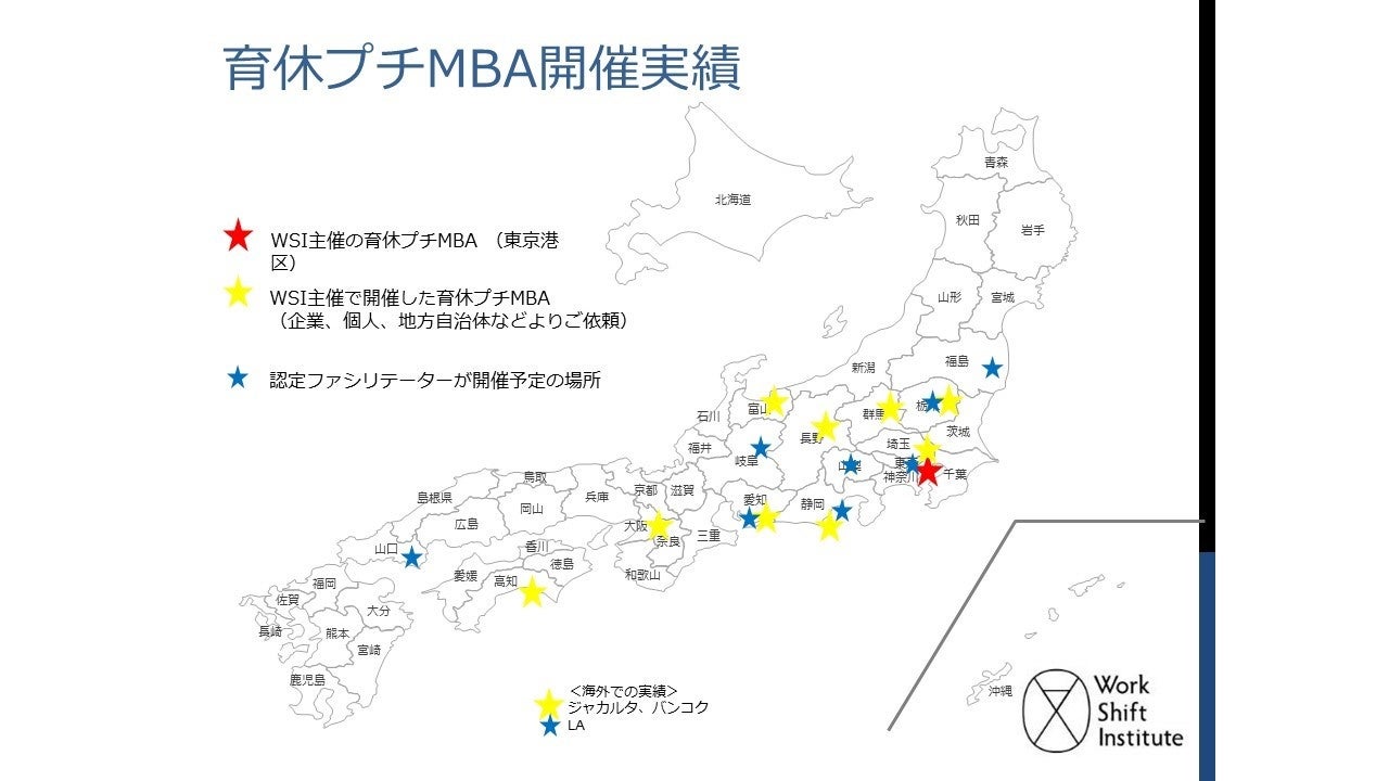 そこで2018年に「育休プチMBA®認定ファシリテーター」制度を設け、育休プチMBA®を個人でも開催できるファシリテーターを養成することで、同勉強会を全国に拡大する取り組みを始めました。これまでに40名を超える方がファシリテーターの資格を取得し、個人あるいは社内講師として、育休プチMBA®を各地で開催しています。