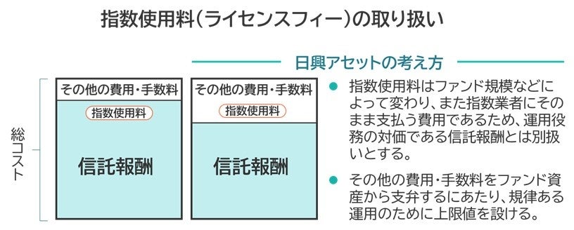 アセットでは、かねて指数ライセンスフィーを当社役務の対価である信託報酬とは分離する考え方を採っています。指数ライセンスフィーは指数業者に支払う費用であり、またファンド規模などによって金額が異なります。そのため、当社の運用する投資信託ならびにETF(上場投資信託)の多くにおいては、「その他の費用・手数料」に含めています。