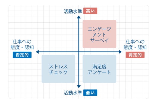 ストレスチェックは不調予防を目的とした「ネガティブ状態の検出」であり、満足度アンケートは活動水準が低いほど高評価になる傾向があります。一方、エンゲージメントサーベイは「前向きに働く心理状態」を定量的に測るもので、仕事への態度・認知×活動水準の両面から“活力ある職場”を可視化する点が特徴です。中でも教師エンゲージメントサーベイは、教員特有の職務構造・人間関係・教育負荷を分析可能な、国内唯一のモデルです。