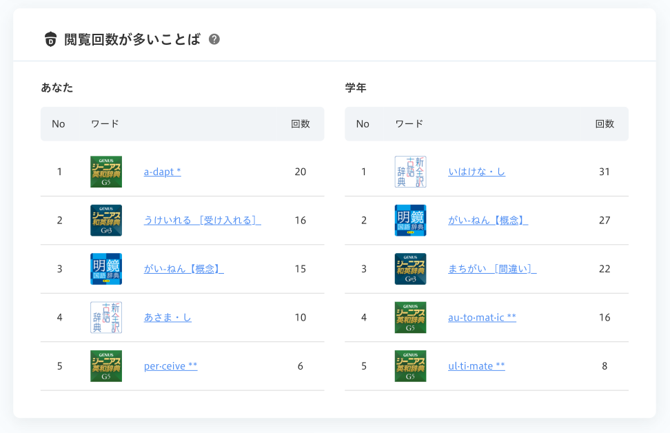 - よく調べられている単語の一覧(ヒットチャート)を学校・学年・クラス・辞書別に表示。