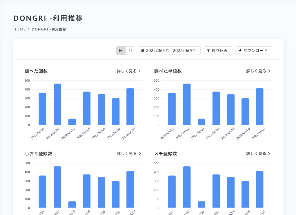 - 利用開始日時や利用回数等を確認することにより、何らかの理由でDONGRIの利用を開始できていない生徒や、辞書の利用が習慣化していない生徒の存在を把握することができます。