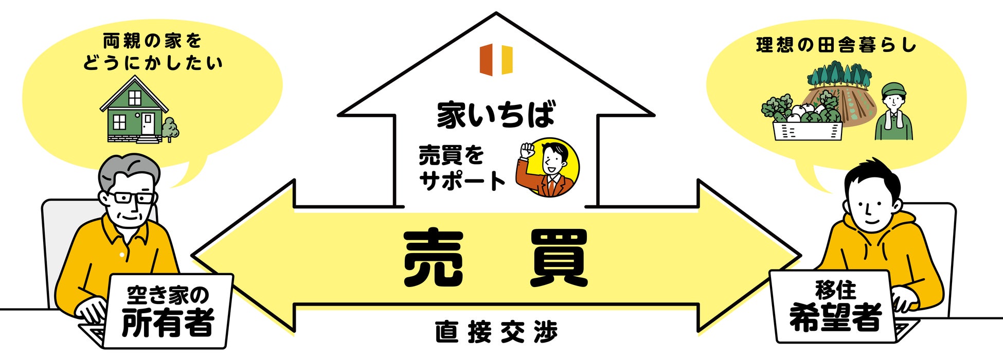 一方、家いちばの空き家バンクは、家いちば社が提供する「セルフセル方式」というまったく新しい仕組みで運営されています。セルフセルとは「自分で売る」という意味で、物件の情報などを売主が自らサイトに掲載し、それを見た購入希望者(買主)が直接売主に問い合わせをして商談や内見を進めることで、お互いに「売る相手」「買う相手」を選ぶマッチングサイトです。