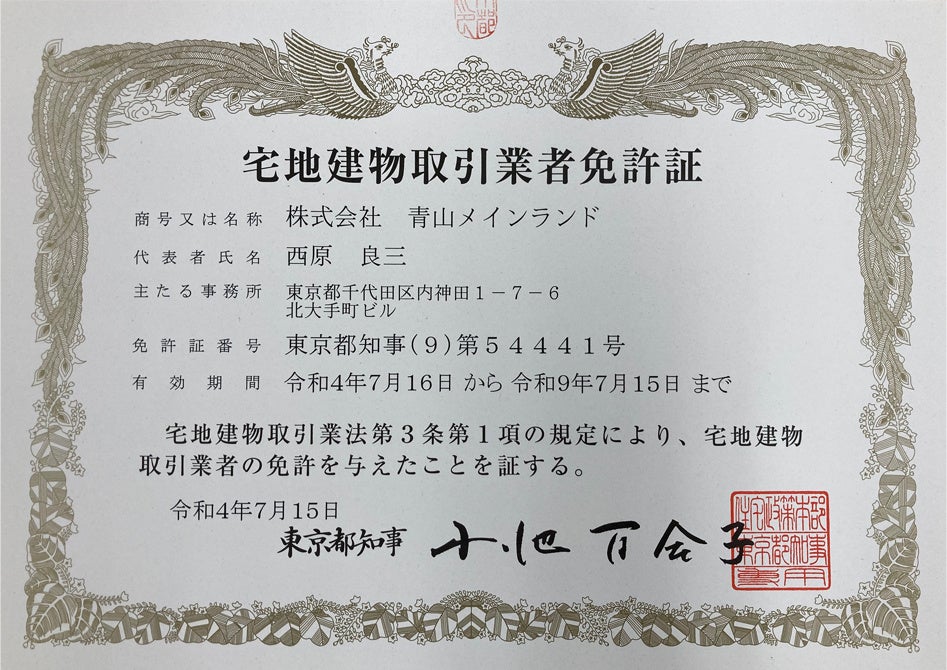 青山メインランド(本社:東京都千代田区 代表取締役社長 西原良三)が不動産業をスタートし35年目を迎え、2022年7月16日より宅地建物取引業の免許証番号が 東京都知事(9)第54441号に 更新となりました。(免許年月日 2022年7月15日)