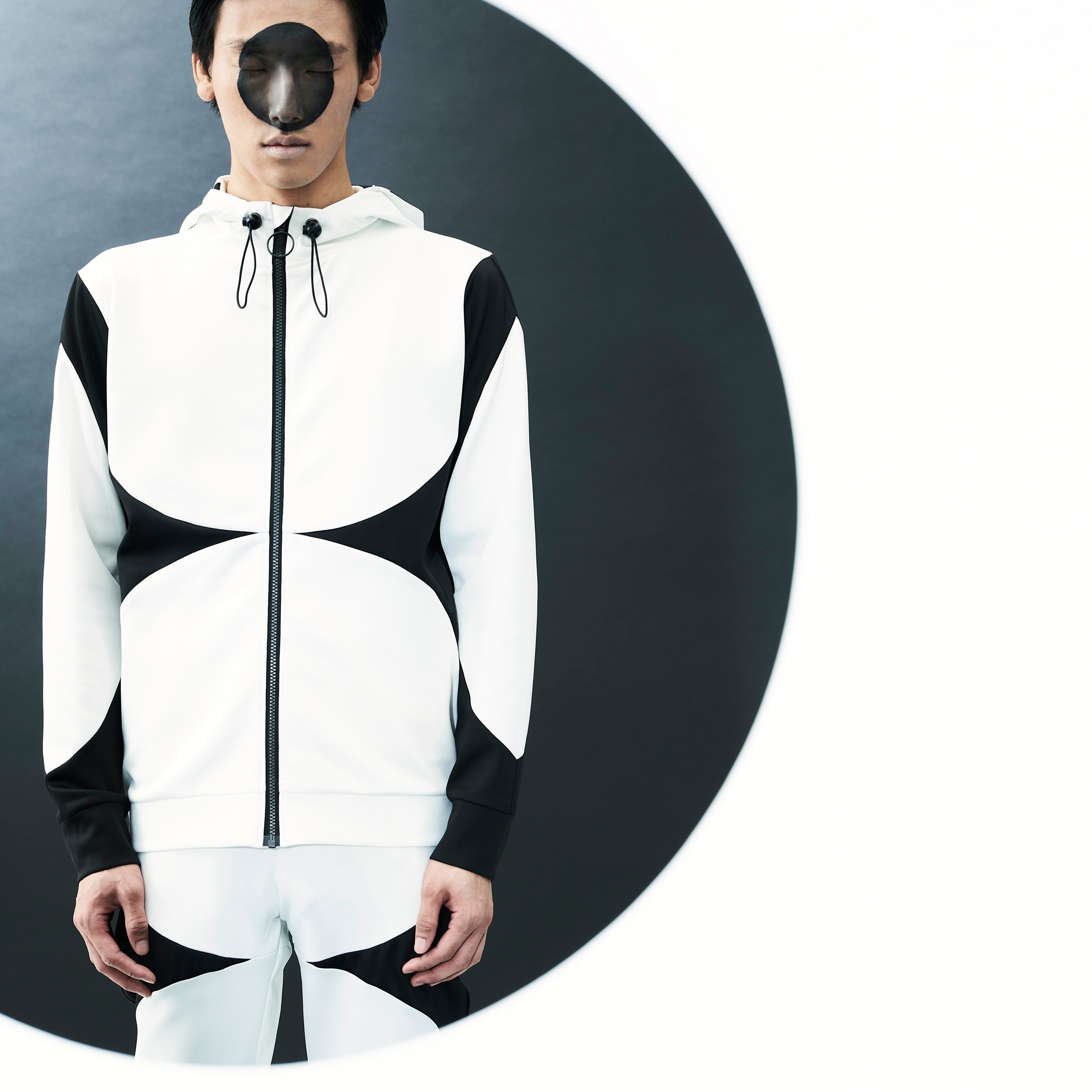 裏地がドットのフードが付いており、すべてのパーツが円や球で構成されている個性的なデザインにも関わらず、シンプルで洗練された印象の一着。