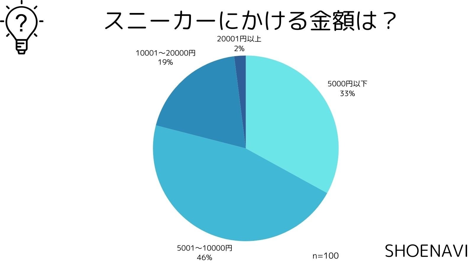 男女100人に「スニーカーにかける金額はいくらですか?」と聞いたところ、第一位は5001~10000円でした。第二位は5000円以下、第三位は10001~20000円という結果になりました。