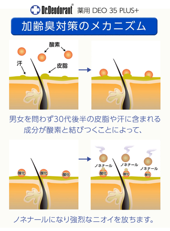 パパママ世代や、加齢臭が気になってきたり早めのケアをしたい方々に向け、ニオイ対策の心強い味方になる「薬⽤ デオ35プラス」をおすすめした。