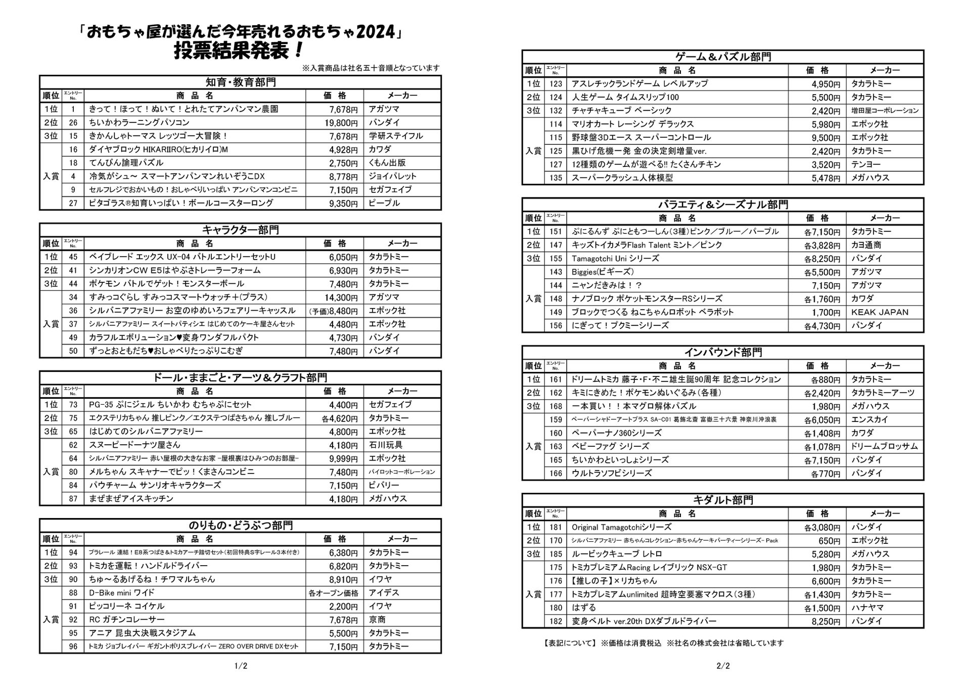 おもちゃを販売している全国の小売業者と卸売業者が、今年の玩具商戦で売れると思うおもちゃ、売りたいおもちゃを投票して決める「おもちゃ屋が選んだ今年売れるおもちゃ2024」の結果が4月10日に発表された。