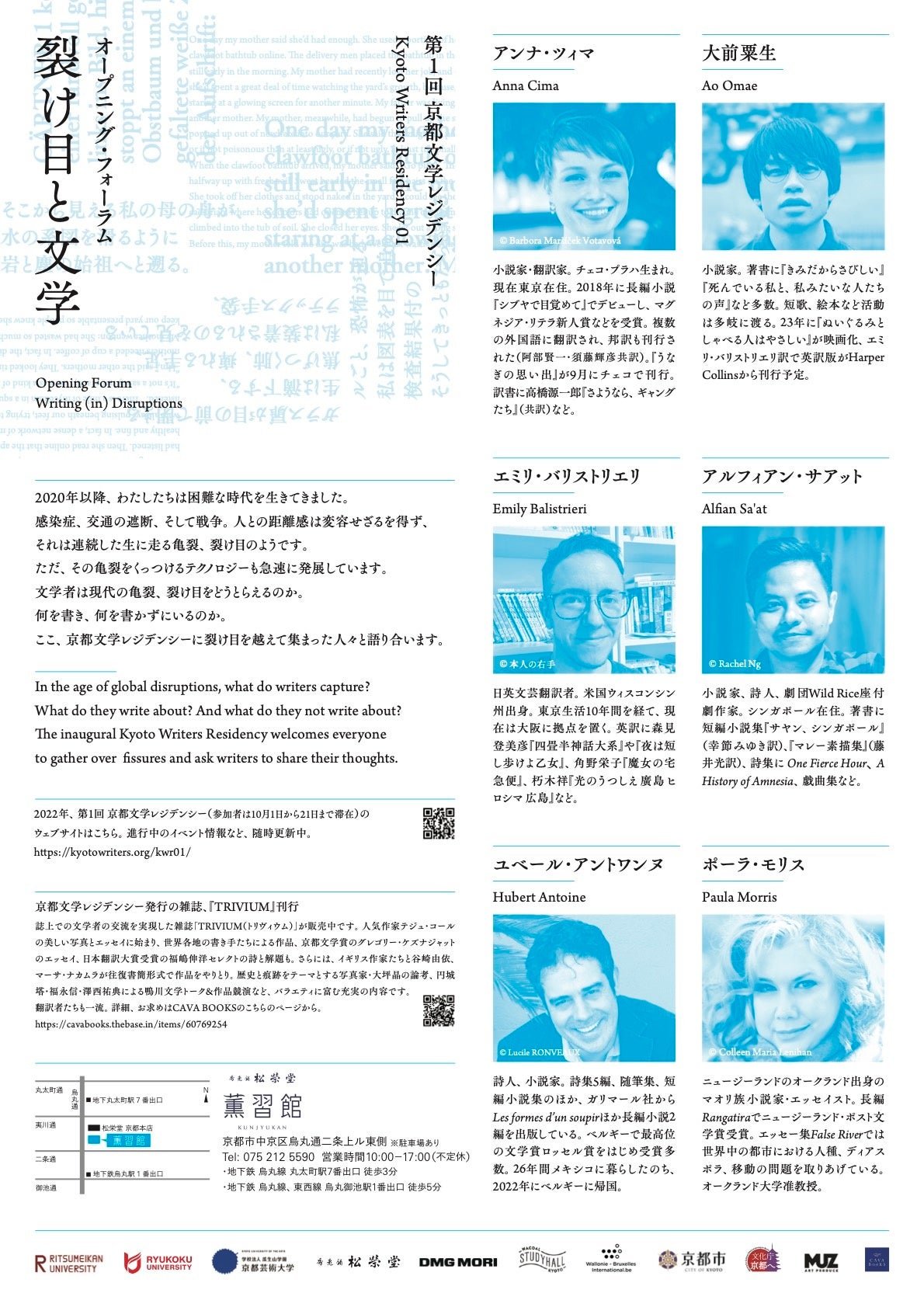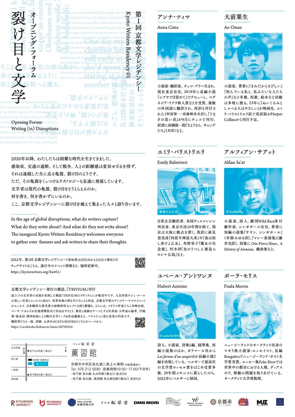 そして今年度、2022年10月1日(土)から10月21日(金)にかけて、第1回京都文学レジデンシーを対面で開催する運びとなりました。国内外から招聘した6名の詩人・小説家・翻訳者が京都に滞在し、創作活動を行うほか、オープニング・フォーラムをはじめとしたイベントを実施します。