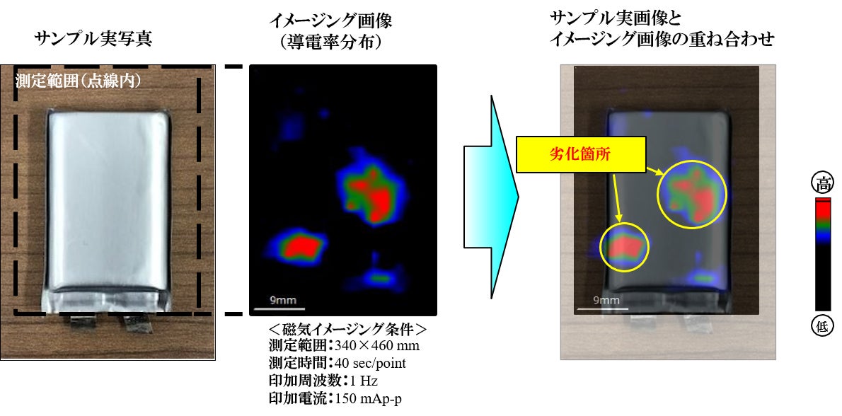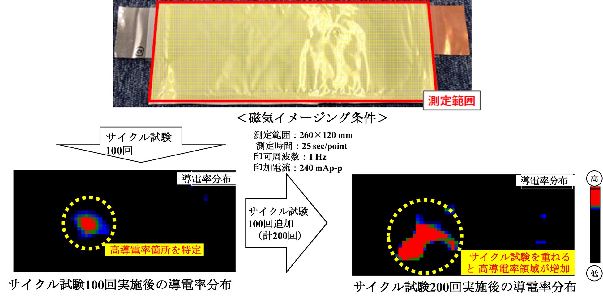 自社の開発結果として、サイクル劣化に伴う導電率分布異常の可視化 (図2) および解体検査によるLi-NMRによる解析の結果、故障箇所では電極の劣化、金属の析出等が確認されております (図3) 。また、磁気センサの開発や測定システムの開発など検査技術の更なる向上に向けた研究開発も行っています。